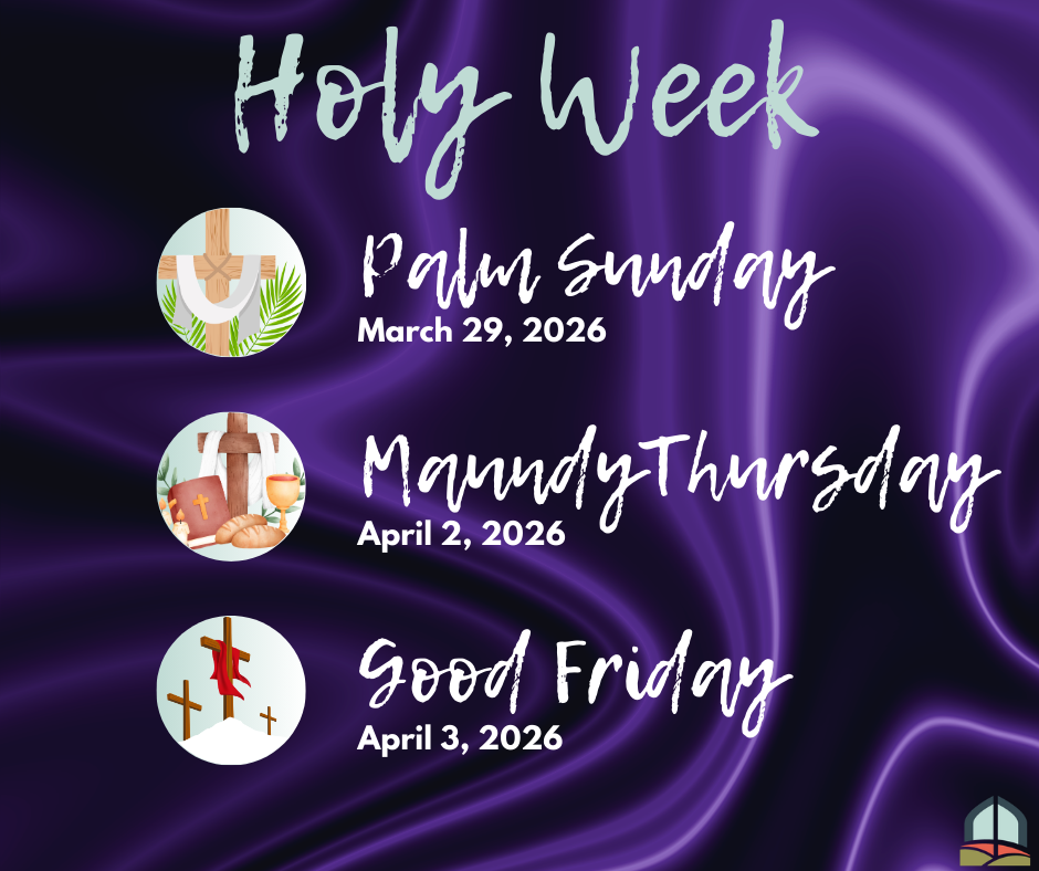 Palm Sunday, March 29 9AM Maundy Thursday, April 2, 6:30PM Good Friday, April 3, 6:30PM